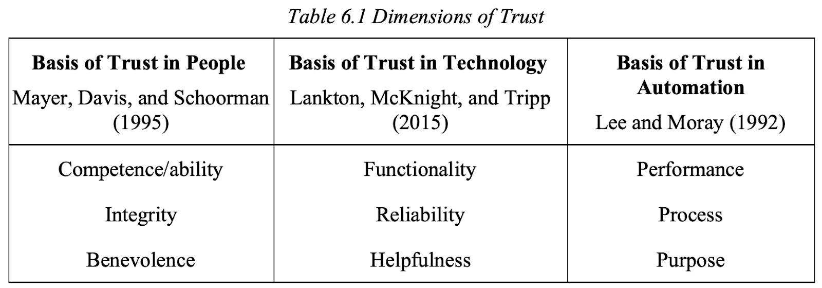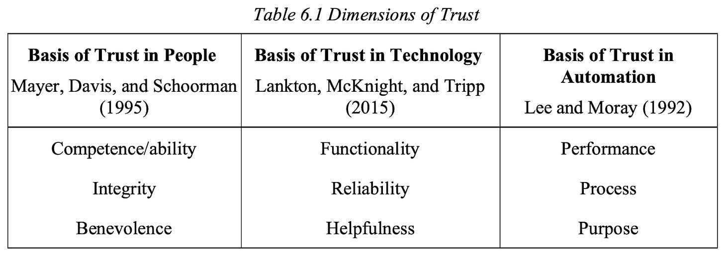 Trust is “a confident relationship with the unknown” (Botsman 2017), and the authors extend this definition to encompassing “the cornerstone of all relationships”. Yet interpersonal trust is built on different pillars than trust between people and technologies, and between people and automation. Reconciling key studies in the field of psychology over multiple decades, the authors devised the following table of what encompassess each of the differing trust relationships;